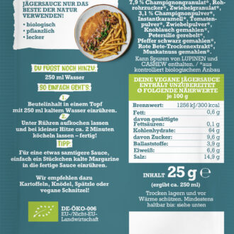 Kinderleicht, blitzschnell und gelingsicher: Einfach den Beutelinhalt mit Wasser erhitzen – fertig! Die cremig-deftige Konsistenz macht die Sauce zum perfekten Topping oder zur Basis für veganes Geschnetzeltes und andere herzhafte Gerichte. Natürlich 100 % vegan, glutenfrei und in bester Bio-Qualität.