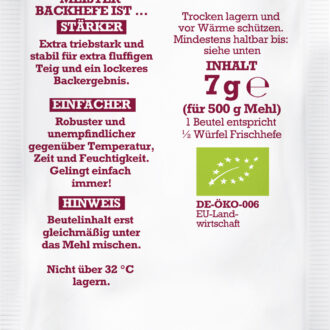 - 1 Beutel entspricht ½ Würfel Frischhefe.