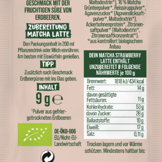 22 % Erdbeerpulver gefriergetrocknet*, Kokosnussmilchpulver* (Kokosnussmilch*, Maltodextrin*), 16 % Matcha Grünteepulver*, Reissiruppulver*, Agavenzucker* (Agavendicksaftpulver*, Maltodextrin*), Ackerbohnenprotein*, Zitronensaftpulver* (Maltodextrin*, Zitronensaftkonzentrat*).